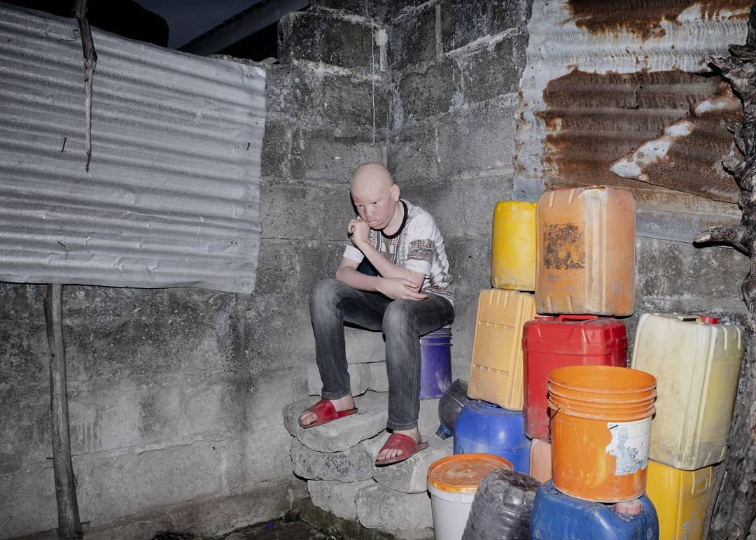 Beneath the photo, a caption read: “A family with albinism from the outskirts of Dar es Salaam, Tanzania. From left to right: Tania (38), Abduli (14), and Moodi (8). Their father tried to sell one of the children on the black market.”